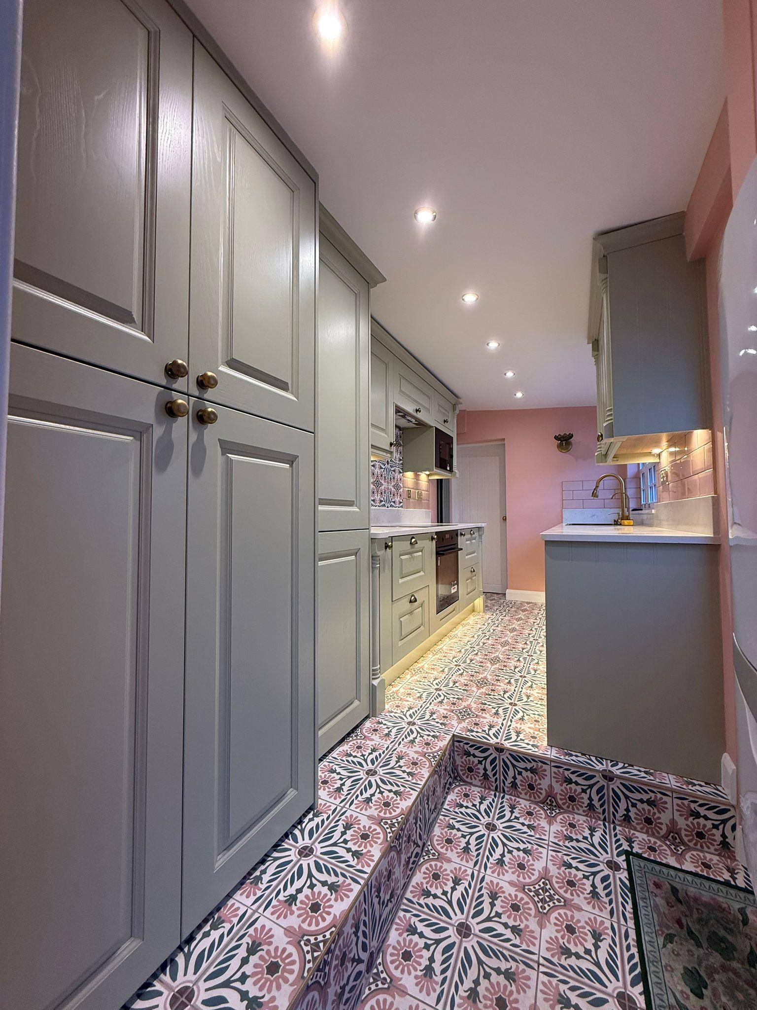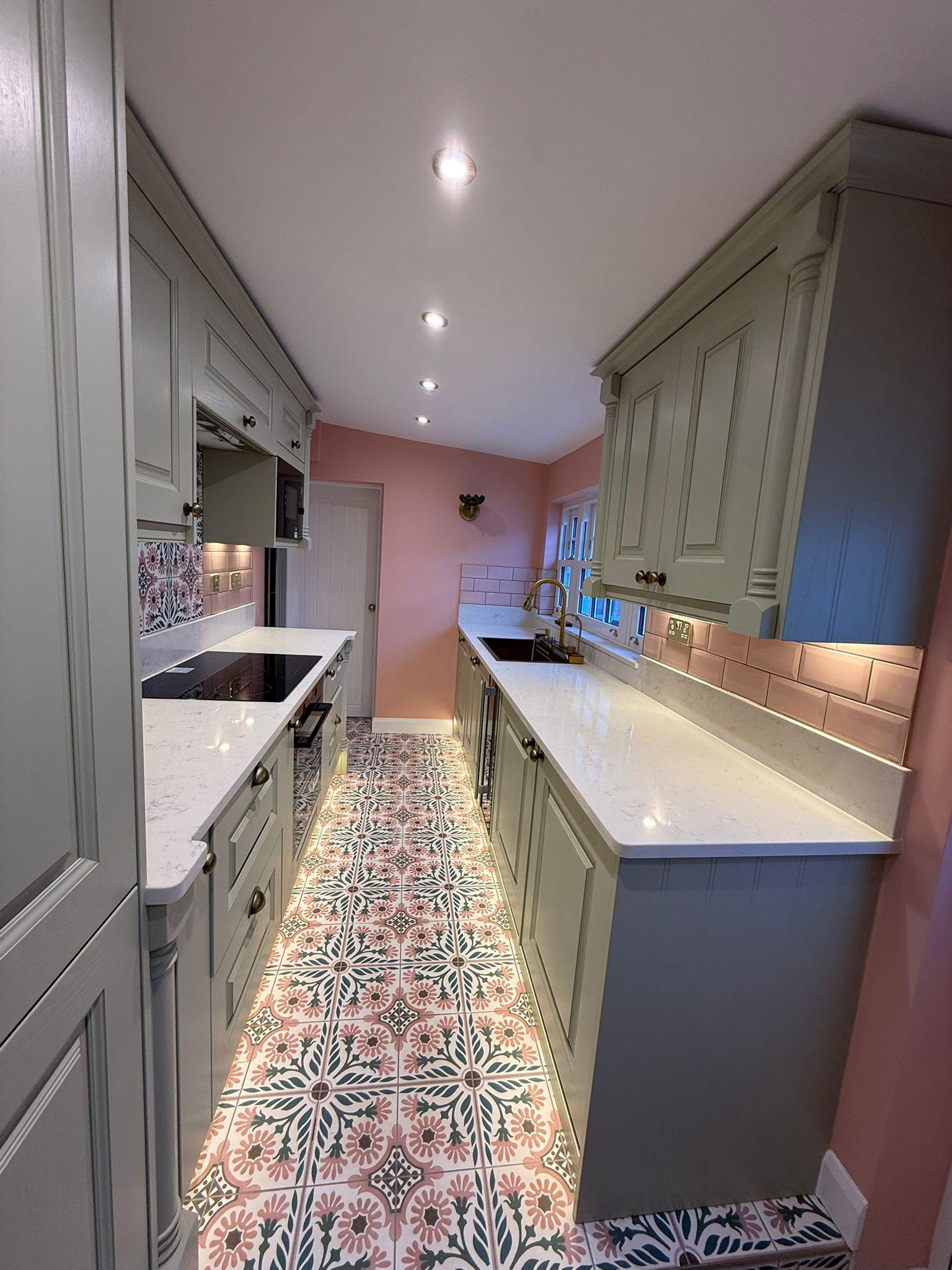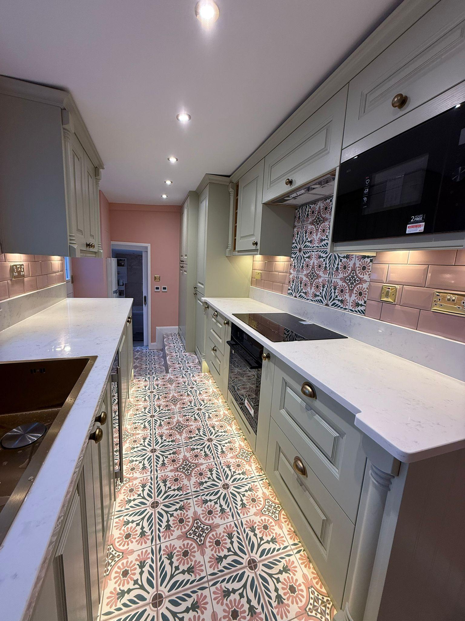 Complete renovation of a galley kitchen, creating a stylish and elegant space with a high-quality finish. The project includes bespoke cabinetry, decorative floor and wall tiling, integrated appliances, and modern lighting. Soft colour tones and thoughtful details were used throughout to deliver a practical yet refined kitchen with a timeless look.